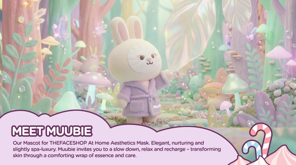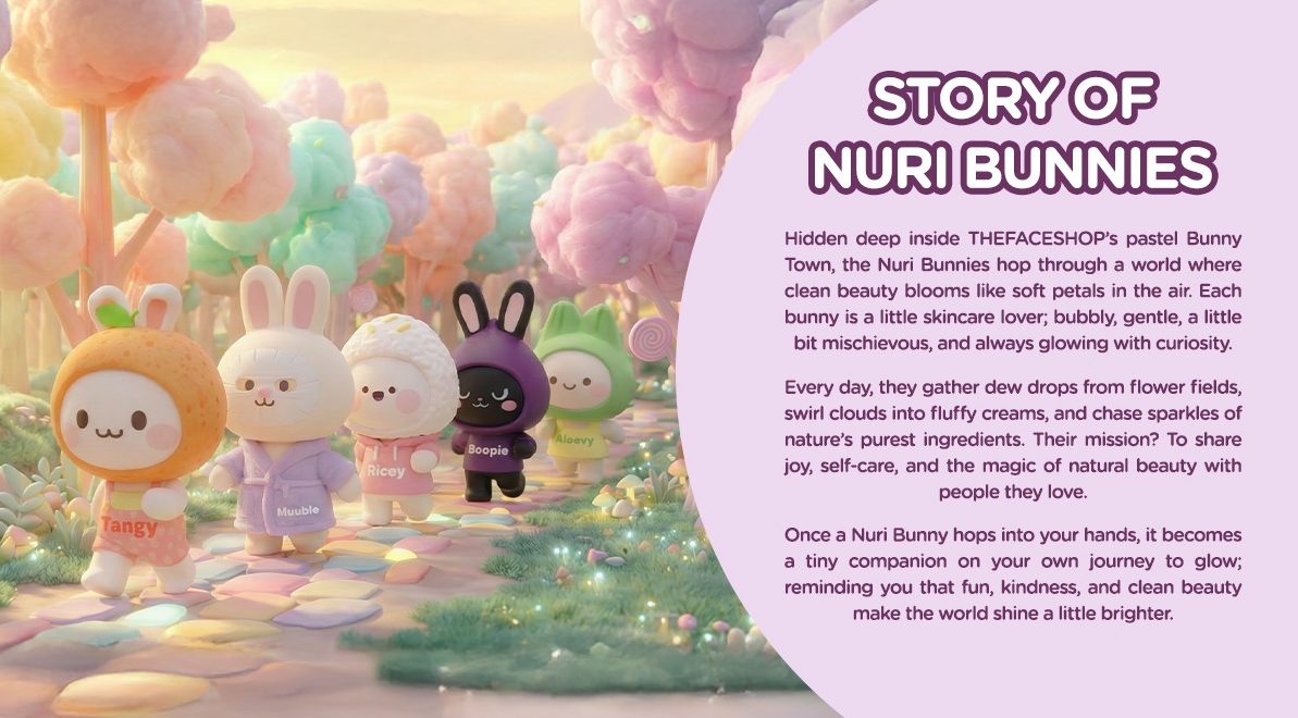 THEFACESHOP introduced a delightful mascot series called the Nuri Bunnies, designed to represent the gentle, playful spirit of their skincare products. Characters such as Muubie and Tangy embody themes like relaxation, brightness, and self-care.